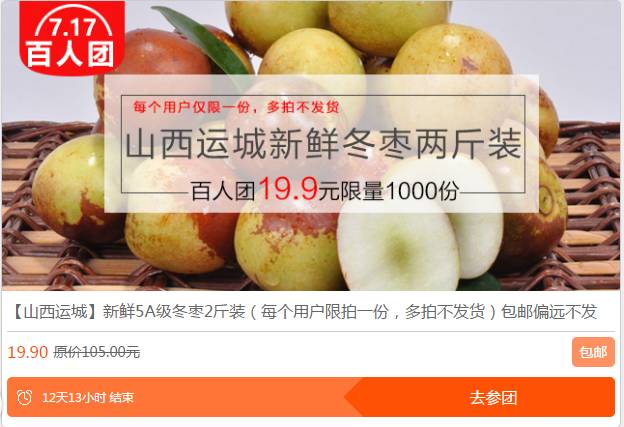 7月17日活动开幕,百人拼团活动随即上线,各路团长火力全开,几千斤山西冬枣疯抢中,一百人来拼团,19.9元拿下2斤山西原产地直供的新鲜冬枣,一石三鸟——物美价廉与健康!